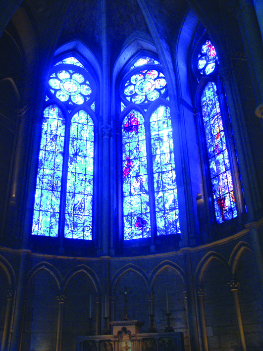 säreget inslag i katedralen. Det är några mycket vackra fönster gjorda i 'nutid' av Marc Chagall. Ett modernt inslag i denna gotiska katedral. Fängslande men ändå tveksam i sin miljö. Säkert mycket omdiskuterad och samtidigt uppskattad. Jag frågar mig, hur ett sådant inslag skulle te sig i en Bach-passion. Finner inga goda exempel på det, men kan tänka mig att måttligt konservativa orkestrar skulle kunna laborera med tanken att väva in slingor av exempelvis, Olivier Messiaen i sitt framförande av passionen. Om det vore bra eller dåligt, lär väl kritikerna slåss om i slutändan.