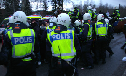 Så blir de stående en lång stund. Demonstranterna i en klump på vägen, poliser och piketbilar i en ring runt dem, med bara några meter däremellan. Stämningen förblir lugn, även om ljudnivån höjs ett snäpp. Demonstranternas olika slagord och sånger avlöser varandra. Polisen håller sig passiv. Inga våldsamheter att tala om förekommer. En tom plastflaska kastas och studsar på en polismans hjälm. Någon sparkar på en piketbuss som kör förbi oroväckande nära demonstranterna. Enda gången det hettar till är när en polisman råkar tappa sitt tjänstevapen och en kollega skriker åt demonstranterna att backa för att låta honom plocka upp det.