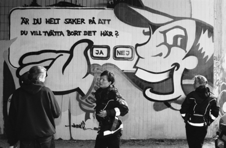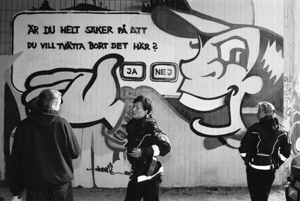 Malcolm Jacobsons bild av Duanes målning har blivit en av den svenska graffitikonstens mest publicerade fotografier. Jag var själv med när den togs, och fotografiet visar hur polisen informerar Gunnar att projektet ska avslutas. De förklarar att han nu fått kännedom om att den som i framtiden målar på väggarna kommer att gripas. Kan Nummelin vara så vänlig att se till att alla får reda på det? Gunnar försöker invända att projektet väl inte kunde vara avslutat. Det är ju ändå hans projekt och han har inte deltagit i någon utvärdering. Men jodå, en utvärdering har gjorts och om Gunnar har frågor kan han vända sig till kommunen.