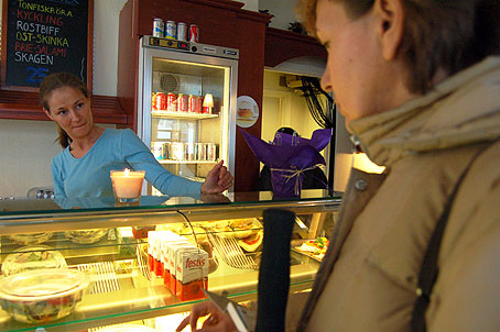 Ulrika Stridsberg, 28, skyndar från kassan och salladsdisken ut i köket där hennes syster Terese, 22, gör i ordning kaféets första vegetariska smörgåsar. De har behållit de gamla borden i kaféets inre rum, men målat om och inrett en barnhörna. Vid knappt hälften av borden sitter lunchgäster. Några har beställt en stor baguette med rikligt med fyllning. Priset 25 kronor är inte för evigt.