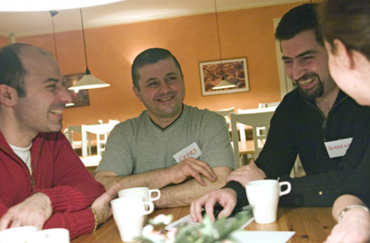 På ett kafé i Flemingsberg kan man öva sin svenska en gång i veckan. Där träffas människor som nyss har flyttat till Sverige och de som har bott här längre. De träffas inte bara för att hjälpa till med språket, utan också för att få social kontakt.