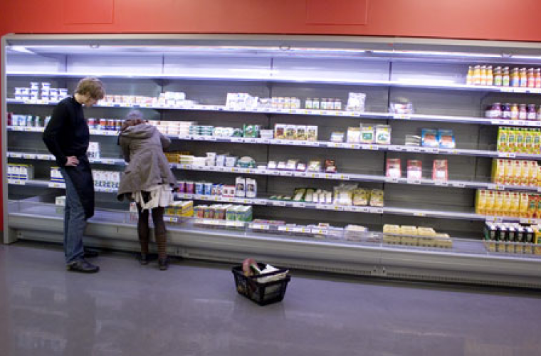 Interiören liknar visserligen inte ett svenskt vanligt snabbköp heller. Det ekar i lokalen inte bara på grund av att kunderna är få och flera hyllor urplockade när GFT besöker butiken, utan mest på grund av den kala betongen och de glest utplacerade metallhyllorna.