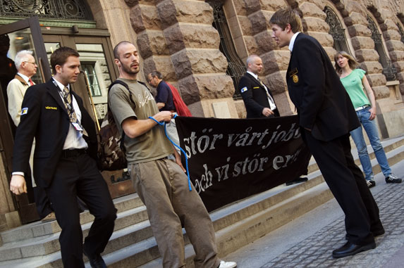Liksom Daniel Schmickl tillhör hon Lärarhögskolans syndikalistiska studentsektion, som i torsdags, tillsammans med ett mindre antal lärare från utbildningssyndikatet inom Stockholms LS och aktivister från syndikalistiska ungdomsförbundet, försökte blockera ingången till riksdagshuset. Målen med aktionen var två. Dels att skapa debatt kring frågan, dels att sätta en egentillverkad dumstrut på Fredrik Reinfeldts huvud.