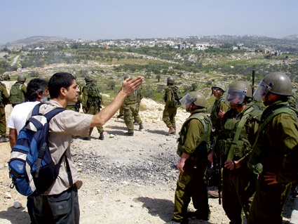 Efter fredagsbönen brukar byborna i Bilin demonstrera. Deras demonstrationståg går fram till muren. Där finns alltid några internationella aktivister, och många av dem är israeler. Shai Pollak är en av dem. Han har varit med länge. Han berättar att han började arbeta politiskt under den andra intifadan, som började år 2000.– De flesta israeler gick politiskt åt höger under intifadan. De sa att palestinierna inte hade någon som de kunde förhandla med. Men på tv såg jag fattiga människor som var arga. När jag såg palestinierna demonstrera, kände jag att det fanns en anledning.Israels militär började bygga muren. Shai var med i en grupp som byggde ett internationellt protest-läger nära byn Masha. Några av dem bildade gruppen Anarkister mot muren. De har protesterat på olika platser på Västbanken. De har även gjort aktioner i Israel. En gång tog de med sig en bit taggtråd från muren på Västbanken. De spärrade av en gata i Tel Aviv med taggtråden, för att visa hur palestinierna har det. Men framför allt vill de hjälpa palestinierna i deras kamp.– Det är bra att israeler är här. Då bråkar militären mindre med palestinierna. Det är också viktigt att israeler och palestinier får kontakt med varandra, säger Shai Pollak.