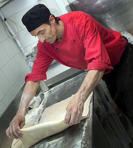 Under tiden han står och bakar ut pastan till små knyten konverserar han avslappnat och svarar direkt när det kommer någon och frågar om något helt annat. Han rör sig snabbt mellan de olika rummen och i köket ger han råd och tips till en av kockarna.