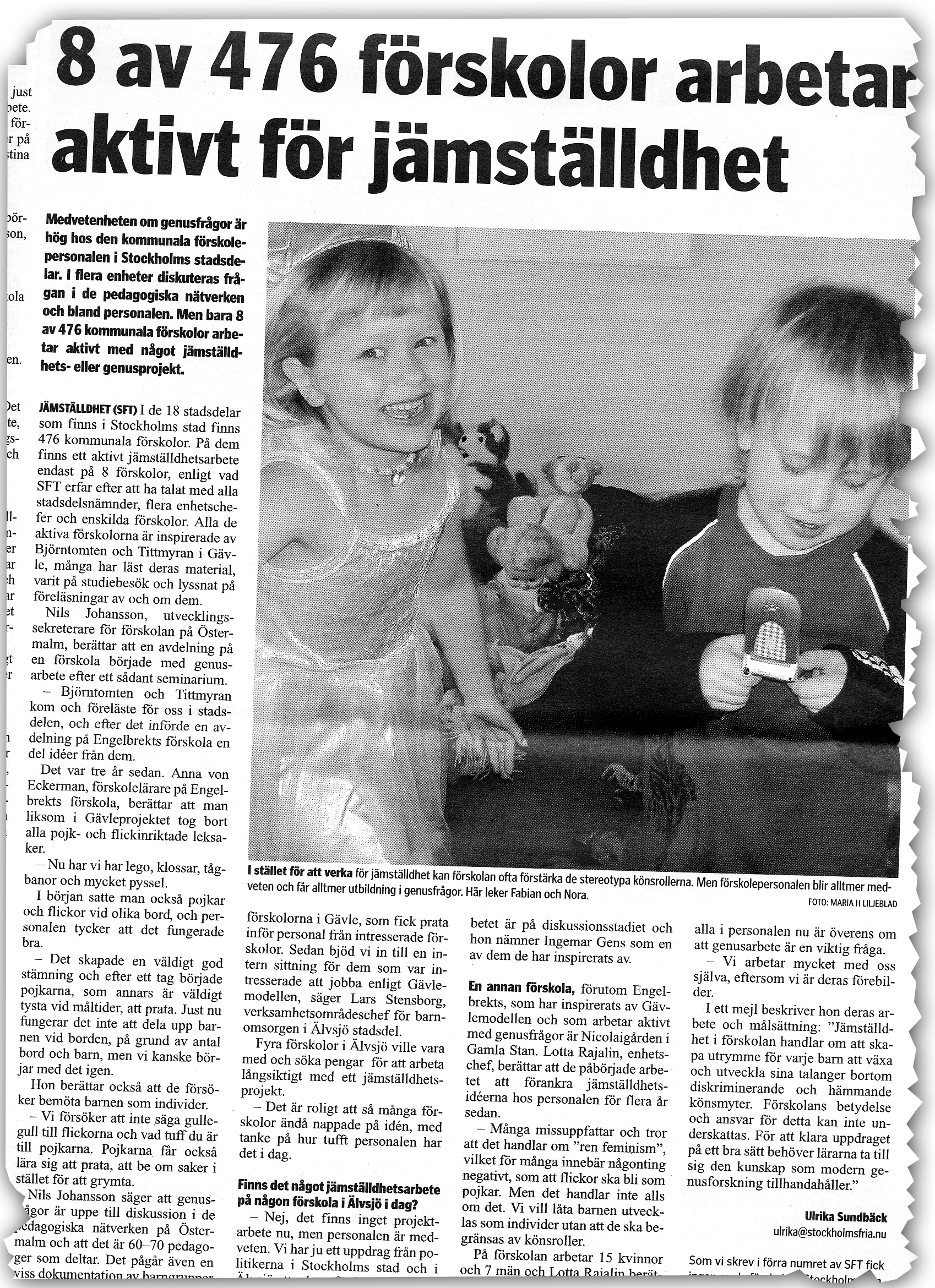SFTs undersökning av kommunala dagis i Stockholm visade att 8 av 476 förskolor arbetar aktivt med jämställdhet. Förskolorna ligger i regel i innerstadsområden, även om intresse för genusfrågor även finns hos förskolechefer och personal i förorterna.