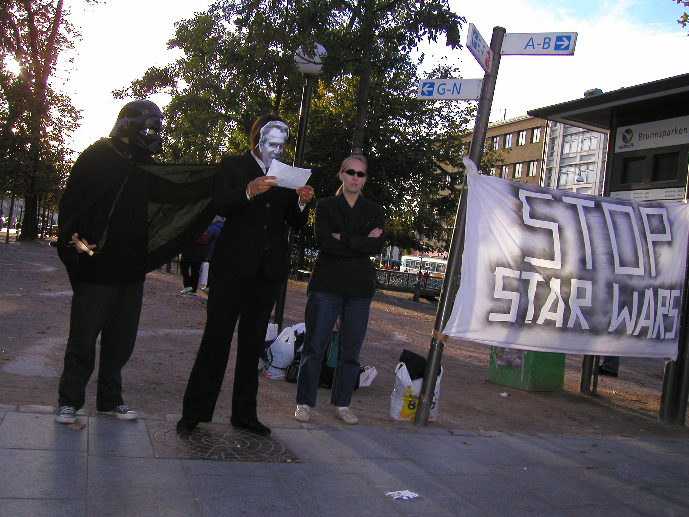Darth Vader och George W Bush bråkar i Brunnsparken om vem som ska dominera rymden och hur. I dag protesterade Svenska Fredskommittén, Ofog och Göteborgs Ickevåldsnätverk mot militariseringen av rymden.