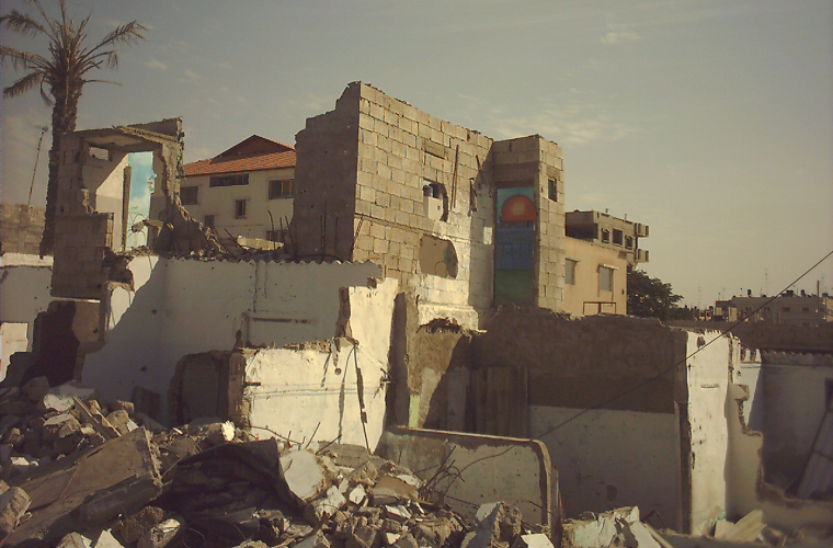 Närmast gränsen står ett hus i ensamt majestät, omringat av ruiner. Av ödets nyck har det motstått grävskopornas vassa blad och vakttornens grovkalibriga eld. Till väster blottar de jämnade husen horisonten, där den omtalade bosättningen Gush Qatif sträcker sig längs stranden och tar havet i anspråk, till öster, likt ett spräckt granatäpple, innanmätet av en konstateljé. På en halvt raserad vägg påminner Klippmoskén om sin närvaro. Rakt söder ut skyms sikten av järnmuren med en igenbommad öppning för pansarvagnar. Likt Colosseum väntar den på att släppa loss odjuren. Norrut slumrar Rafah i drömlösa nätter, fasaderna är perforerade av kulor, fönster och balkonger sedan länge igenmurade.