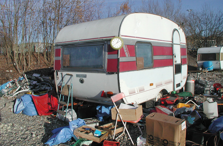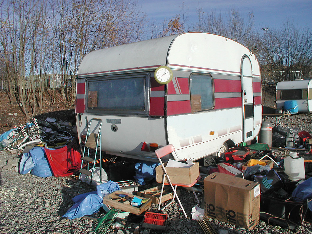 På platsen finns fem husvagnar. En man och en kvinna står utanför sina vagnar och röjer bort skräp.