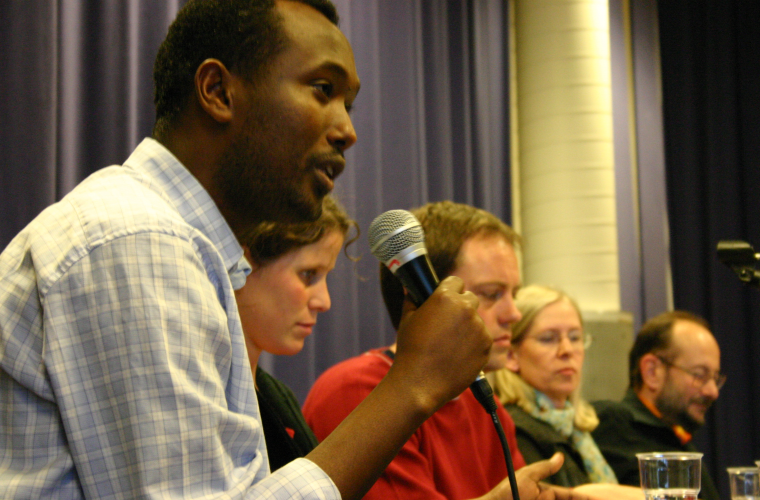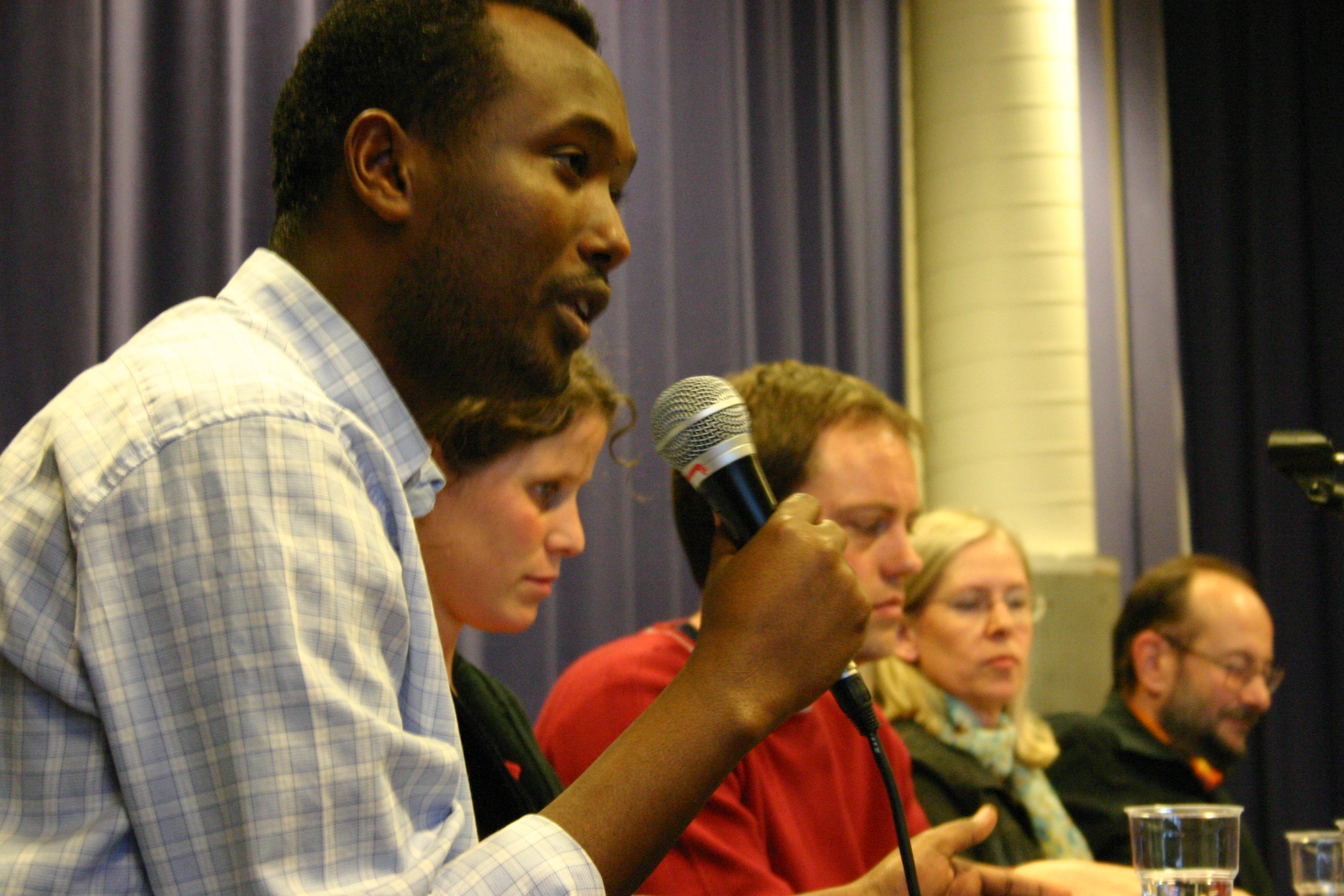 Så dyker Elmi Abdi upp. Han är socialdemokratisk lokal- och regionpolitiker i Norra Älvsborg och tycker att det behövs en representant för socialdemokraterna där framme vid podiet.