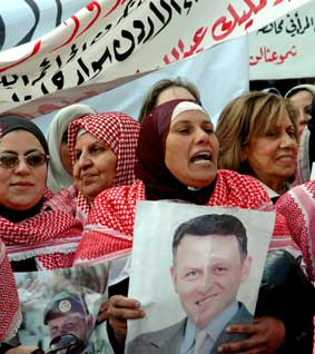 En vecka efter attentaten i Jordanien den 9 november (se även utrikes sidan 8) samlades flera kvinnogrupper utanför ett av de drabbade hotellen, SAS Radisson, i huvudstaden Amman. Omkring femhundra kvinnor, ledda av prinsessan Basma, tågade under slag-ord, med kungens porträtt i händerna, mot ett av de andra drabbade hotellen Grand Hyatt. 'Jordaniens kvinnor tillsammans mot terrorism' stod det att läsa på en av banderollerna.