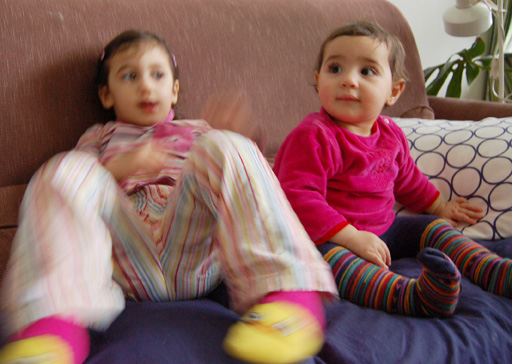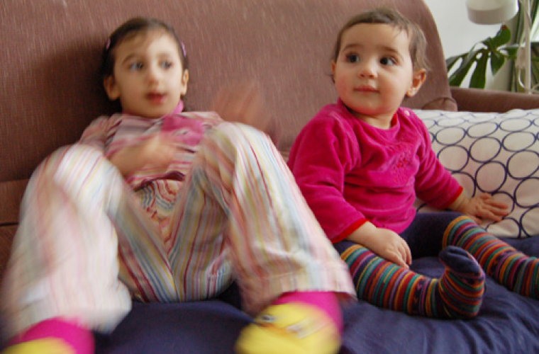 Melissa har vaknat från sin tupplur och kommer yrvaken in i köket. Hon ger sin mamma en kram och går sedan in till vardagsrummet och tittar på sitt favoritprogram Teletubbies. Sonia har tröttnat på att sitta still i barnstolen och Siham lyfter ner henne på golvet. Hon tittar sig storögt omkring och kryper sedan in till sin storasyster i vardagsrummet.