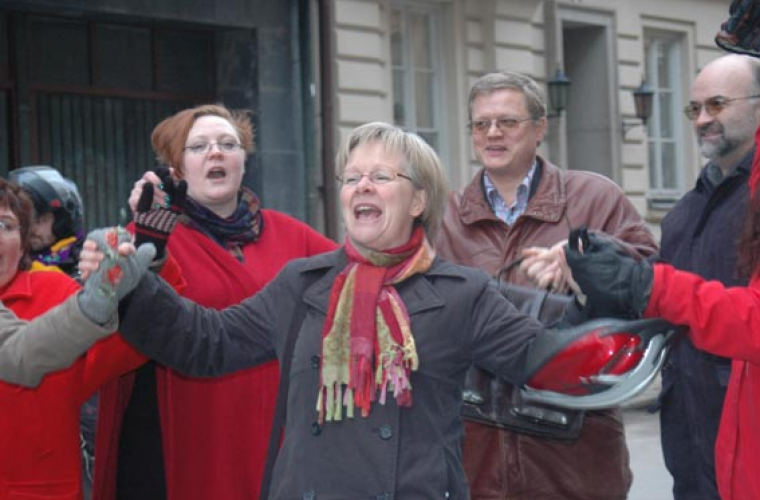 • Wanja Lundby-Wedin sjunger Internationalen tillsammans med LO-medlemmar utanför Frankrikes ambassad.