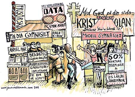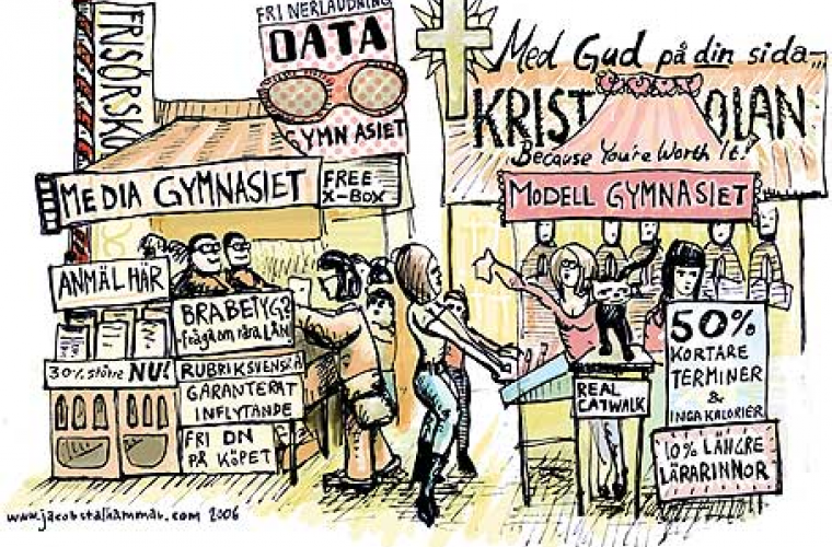 Men redan på kort sikt finns det bekymmer. Vad händer med exempelvis gymnasieskolan när marknadstänkandet träder in? Vi har redan kunnat se hur betygen stiger, hur sponsring av läromedel blivit ett vanligt inslag och hur skolor lockar elever med attraktiva program i media, teater eller turism. Är skolorna frikostiga med höga betyg för att inte få rykte om sig att vara dåliga skolor? Är sponsrade läromedel ett enkelt sätt att kostnadseffektivisera? Är utbildningar i media bara ett sätt att locka elever? Och, ännu viktigare, vad händer med de ungdomar som väljer fel? Som söker skola enbart för att kunna syssla med sina fritidsintressen och som sedan inte får något jobb? Vart ska de vända sig? Vem tar ansvar för deras misslyckande? Eller kommer de att nöja sig med förklaringen att platserna på skolan behövde fyllas för att ekonomin skulle gå ihop?