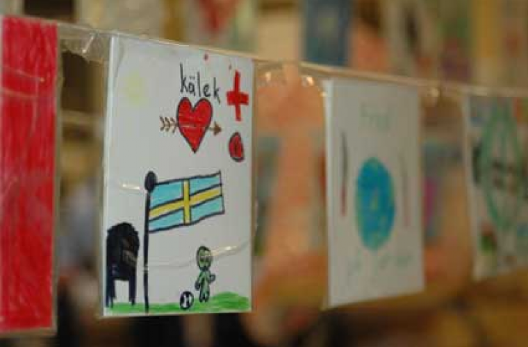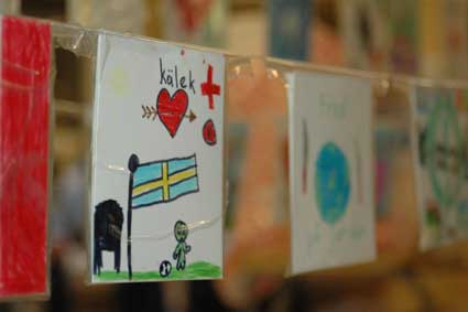När Sesam var på besök var några banderoller redan färdiga. De yngre barnen hade redan gjort dem färdiga. Barnen hade ritat olika saker som världen behöver för att samarbeta. Ett barn har ritat ett gameboy. Ett annat barn har ritat ett hakkors med ett stort kryss över. Ett annat barn har skrivit sitt namn.