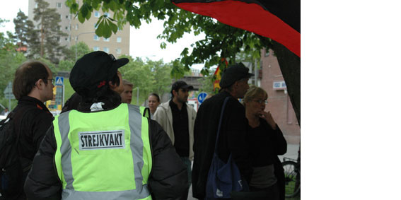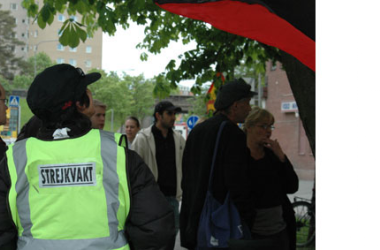 • Syndikalister från Västerorts LS går strejkvakt utanför Öppna hemtjänstens lokaler i Hässelby-Vällingby.