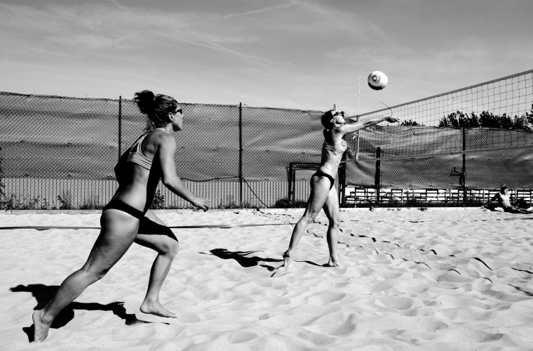 Sanden yr omkring de barfota tjejerna som värmer upp på Göteborgs beachvolleyboll clubs utomhusbana i Åby. I ett allt intensivare tempo bollar de till varandra.