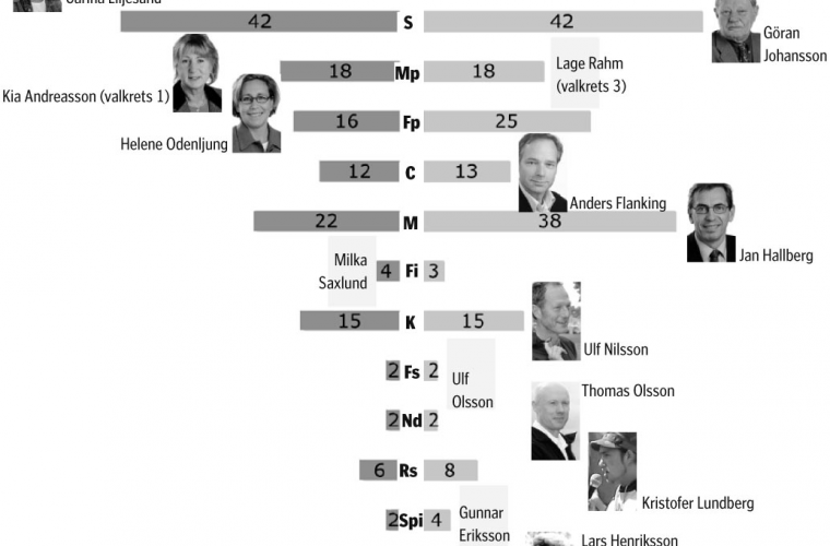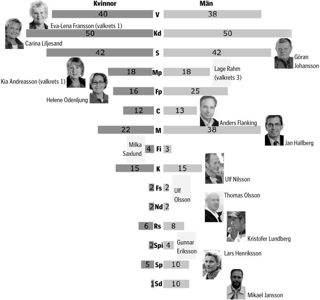 Bland partierna inom det borgerliga blocket (m, c, kd, fp) är den kvinnliga representationen lägre, strax över 42 procent. Längst ner på listan bland de etablerade partierna hamnar moderaterna, med 37 procent kvinnor. På topp ligger vänstern med dryga 52 procent kvinnor.