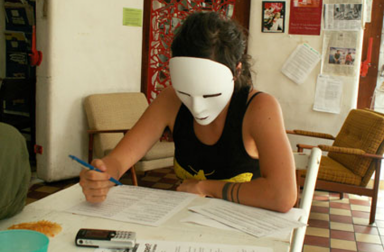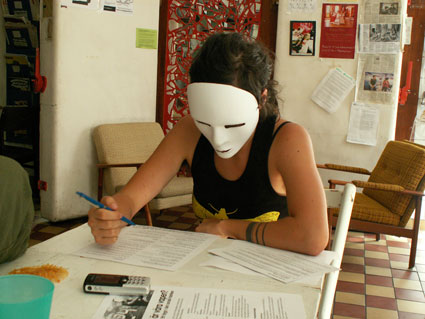 • En del av det ansiktslösa motståndet fyller i Osynliga partiets enkät på kaféet Glassfabriken i Malmö.