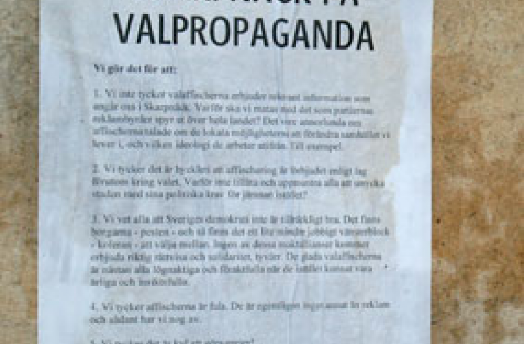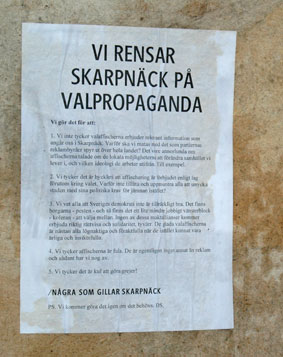 Utanför Skarpnäcks tunnelbanestation fanns tidigare folkpartiets valaffischer uppsatta. Dessa är nu bortplockade, och träspånsskivorna där de tidigare satt pryds istället av uppklistrade flygblad som förklarar varför valpropagandan bannlysts från stadsdelen. Bland annat kan man läsa att: 'Vi tycker inte att valaffischerna erbjuder relevant information som angår oss i Skarpnäck. Varför ska vi matas med det som partiernas reklambyråer spyr ut över hela landet?'