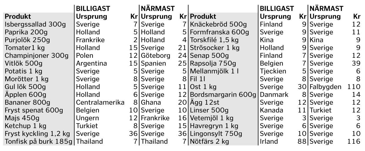 När vi valde de varor som hade producerats närmast Göteborg minskade resvägen med över 3 000 mil. Kassen blev samtidigt cirka 170 kronor dyrare.