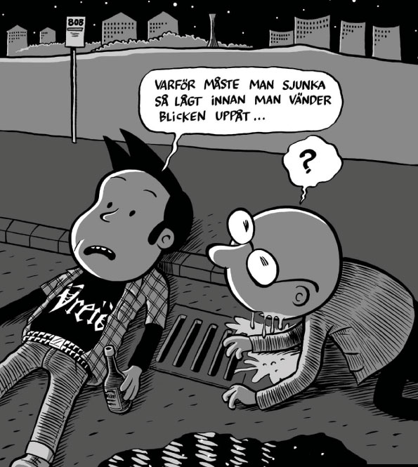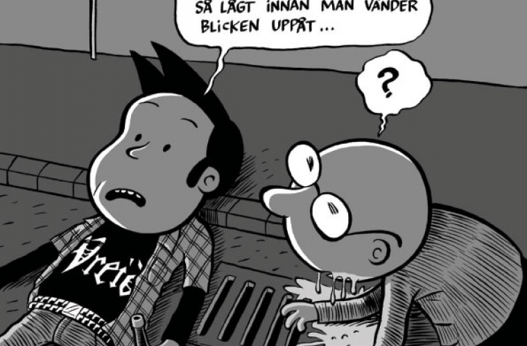 'De dödas gryning' är göteborgaren Nickan Jonassons andra album där han med distinkt men enkelt tuschade rutor berättar om vännerna Karl och Conny.