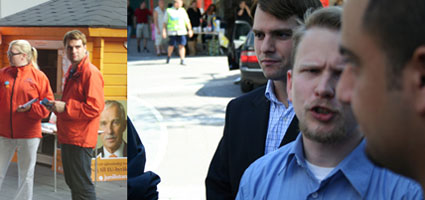 På bilder från mötet syns bland annat partiets toppkandidat Marc Abrahamsson. Till vänster om honom står en person som under denna valrörelse inte enbart arbetat för Nationaldemokraterna utan även för folkpartiet.