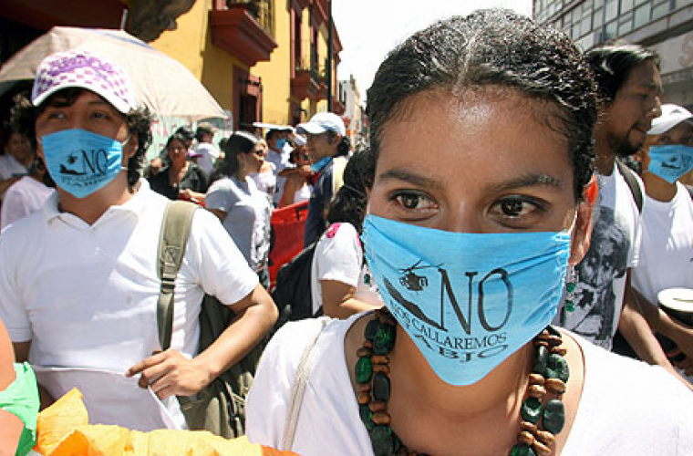 • ”Vi håller inte käft” står det på munskyddet som en kvinna bär under en protest mot Oaxacas guvenör Ulises Ruiz.