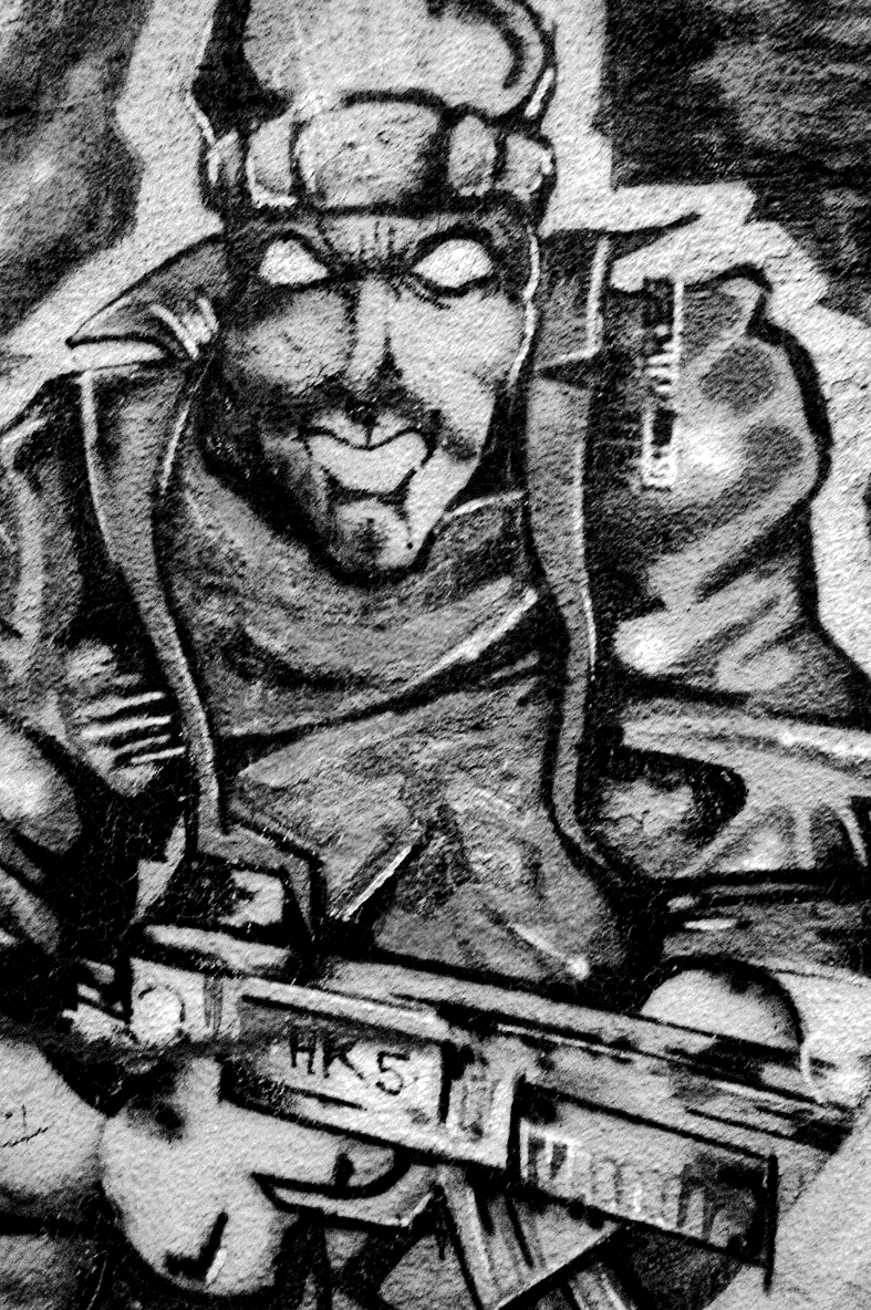 I huset ligger Rågsvedsgården, som i slutet av 1970-talet och början av 1980-talet blev känd genom att den fungerade som hemmascen åt punkband som Ebba Grön. Ingången till ungdomsgården ligger i målningen och SHOF har integrerat passagen genom en målad träskylt som upplyser om vart man är på väg. Längst till höger i bilden står det också Rågsvedsgården i en straight-letter-text målad som vore den av guld, intill två figurer hämtade ur Vaughn Bodés serietidningsvärld.