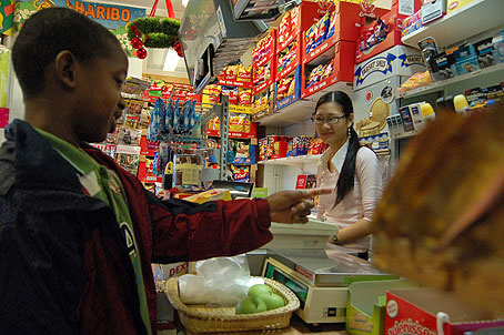 - Vi jobbar sju dagar i veckan, trehundrasextiofem dagar om året. Men en familj kan fortfarande försörja sig på det här, det blir en normal månadslön ungefär, säger han och går för att slå in en kvinnas mjölkpaket.