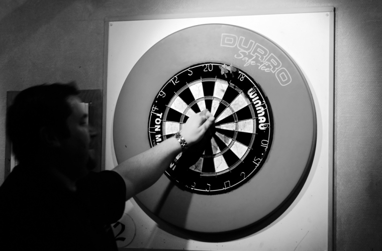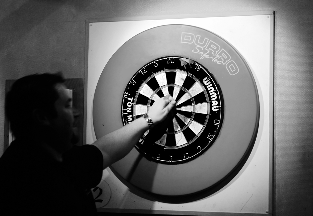 - För ställer jag mig och kastar bullseye mot honom, då vinner han.