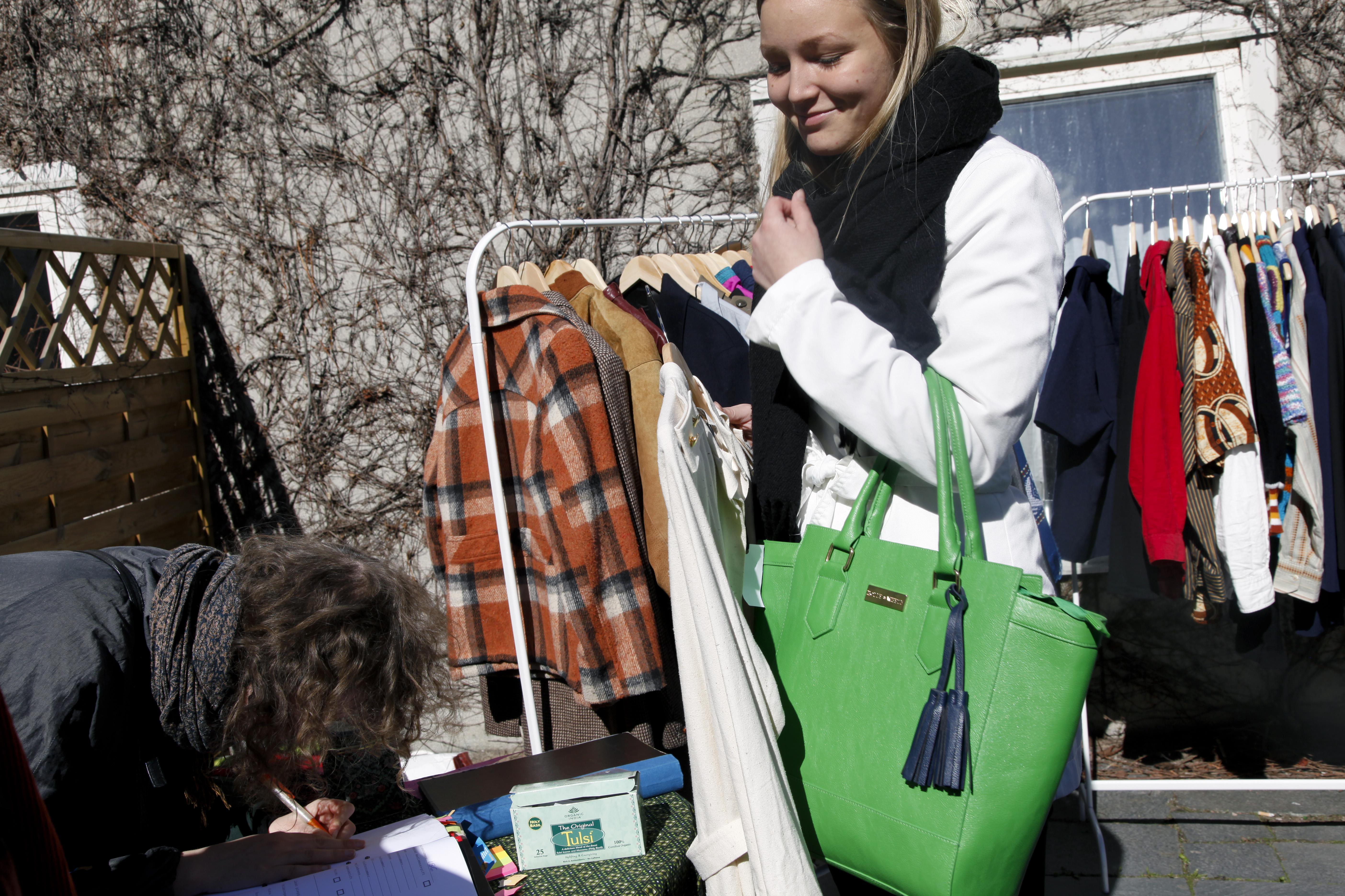 På en solig bakgård i Uppsala fladdrar kläder från sina galgar, vissa från klassiska klädställningar medan andra dekorativt hänger från ett träd. I bakgrunden sprakar svensk 1940-talsmusik som om den fortfarande spelades på en gammal grammofonspelare. Det som skulle kunna uppfattas som en bakgårdsloppis är i själva verket en plats för utlåning av kläder – ett klädbibliotek.