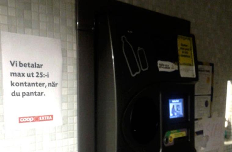 I dag finns ett meddelande bredvid automaten som upplyser att kunden kan få kontant ersättning: men max 25 kronor. Två män står i utrymmet och har precis tömt sina plastkassar. De anser att det är självklart att få pengar för sina pantburkar – och de tycker även att det är bra att informationen på rumänska avlägsnats: