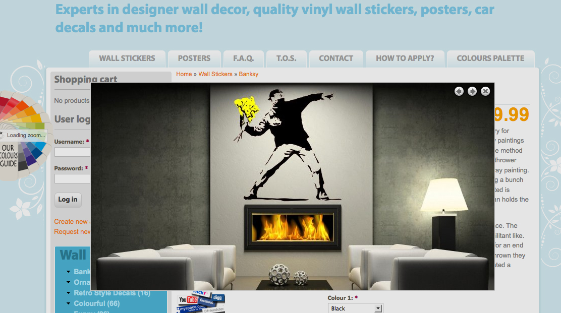 Det brittiska heminredningsföretaget Broomsticker säljer motivet i en rad olika storlekar (från 9.99 pund och med möjlighet att välja mellan blomsterkast åt vänster respektive höger) och konstaterar i försäljningsmaterialet att mannen som håller blommorna har ett militant utseende men kastar blommor istället för granater. De menar (fritt översatt) att "Banksys blomsterkastare kräver ett slut på de grymheter som i krigets namn begås här i världen. Blommorna är fredsbringande och när de kastas kommer de att spridas och skapa fred. Detta är grundtanken bakom målningen. Banksys blomsterkastare har parafraserats många gånger och är ett ytterst populärt verk."