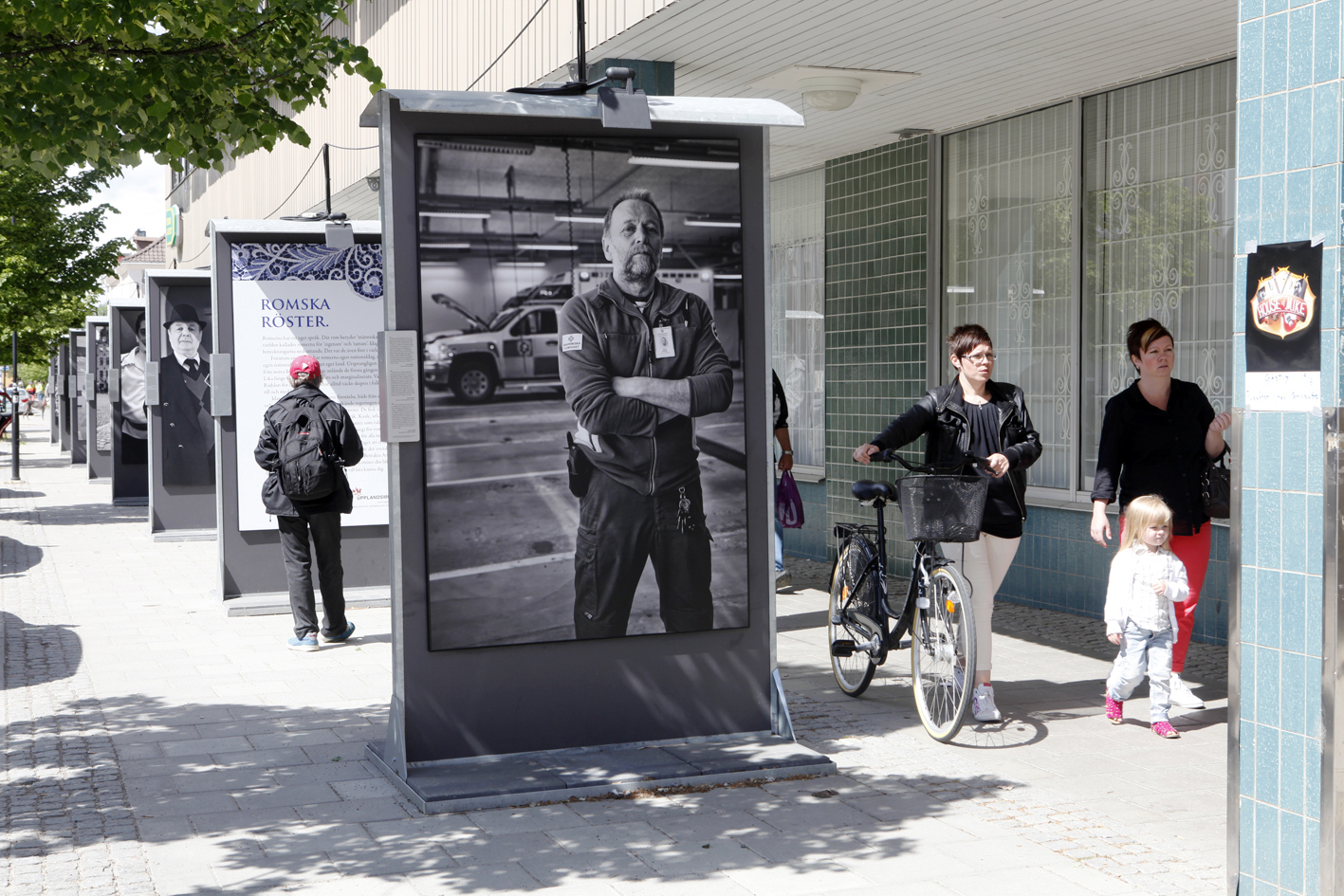 De svartvita bilderna är 2 meter höga och 1,5 meter breda och är tagna i Uppsala- och Stockholmstrakten av fotografen Anders Ryman. Bilderna presenterar personer från olika romska grupper, till exempel polska, rumänska och finska romer samt resande. Olika sysselsättningar skildras också, till exempel en modersmålslärare, en anställd på en bilverkstad och barn som går i skolan.