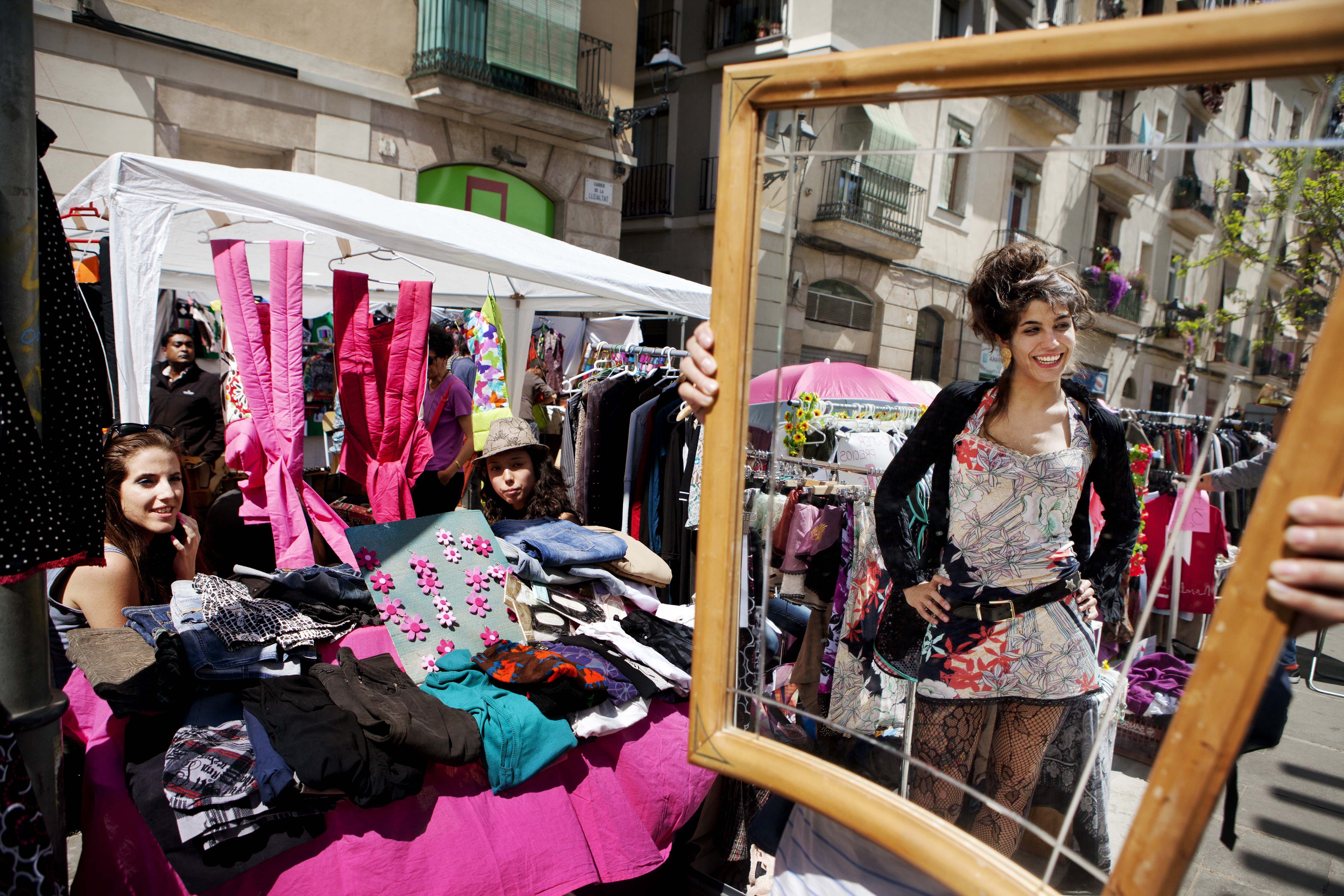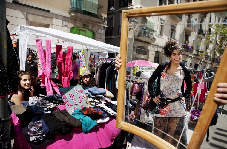 Det är en solig söndag och marknaden breder ut sig på Barcelona-stadsdelen Ravals gator. Nyfikna besökare strosar bland borden där det säljs second hand-prylar och egendesignade kläder, hantverk och konsthantverk. Sedan den ekonomiska krisen slog till arrangeras allt fler marknader av den här typen i Barcelona.