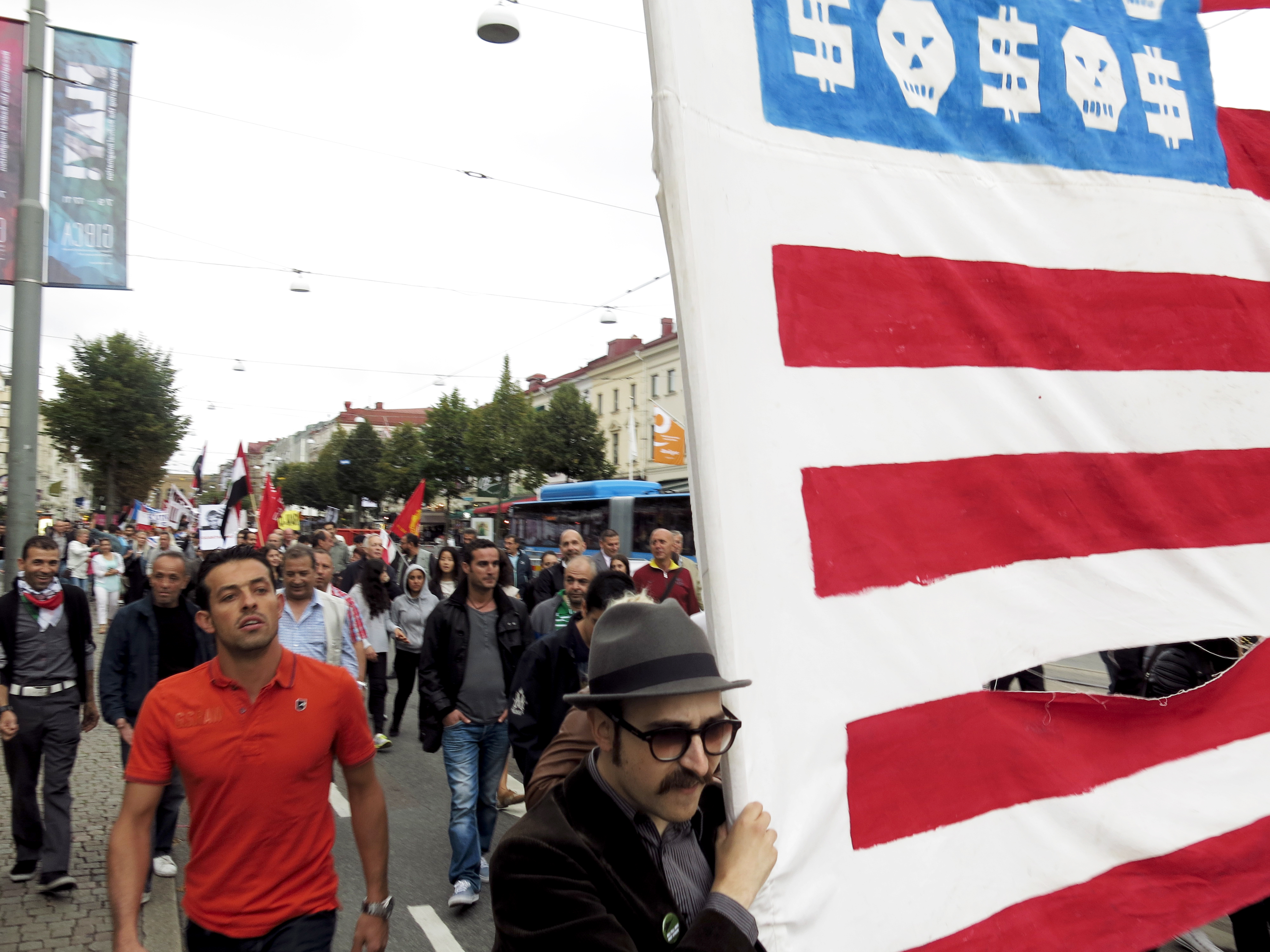 "Obama mördare – Reinfeldt hycklare" ropade demonstranter som samlats på Götaplatsen för att tåga mot Gustav Adolfs torg. Längs fram i det runt tusen personer långa tåget hölls en gigantisk banderoll med texten "US Terrorist". Det främsta budskapet, som framfördes både i talkörer och från talarstolen, var ett nej till USA:s krigspolitik.
